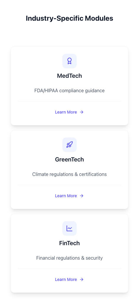 Navigate the unique challenges of your industry with customized modules like MedTech compliance, GreenTech regulations, and FinTech security.